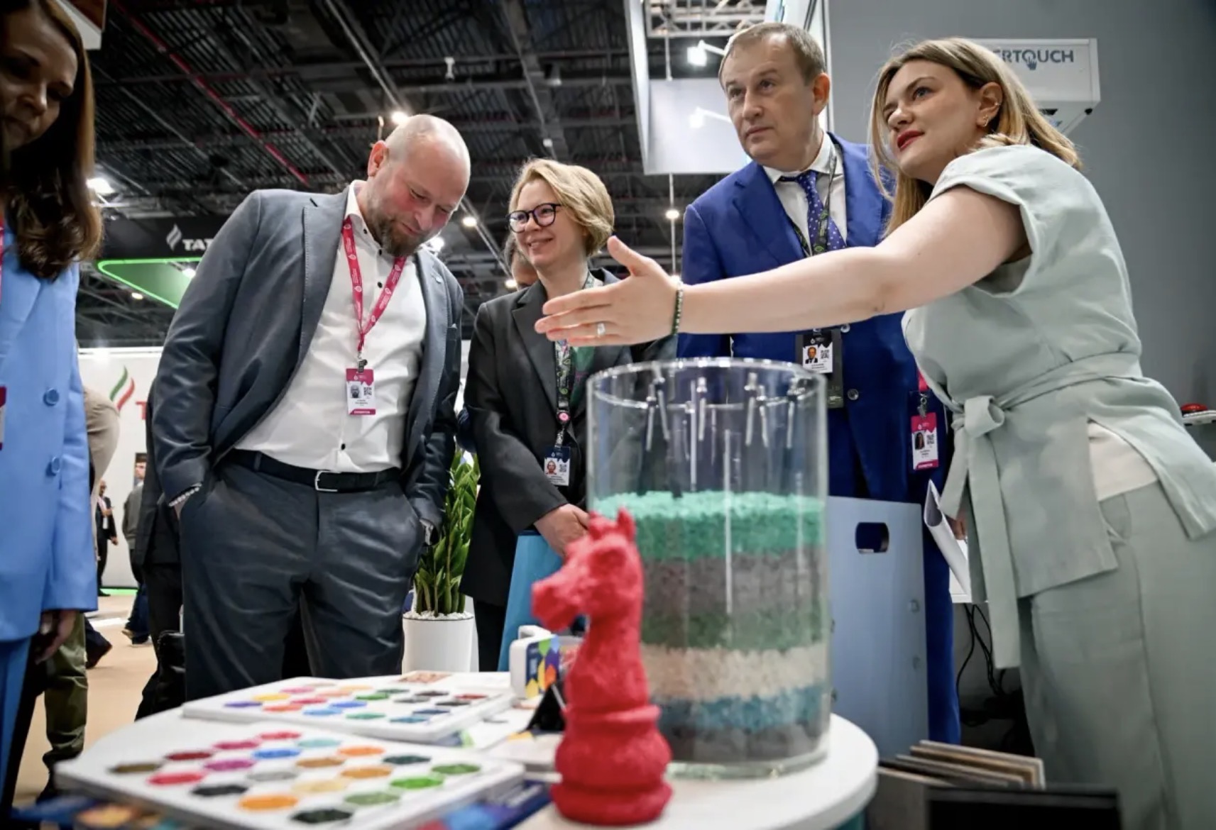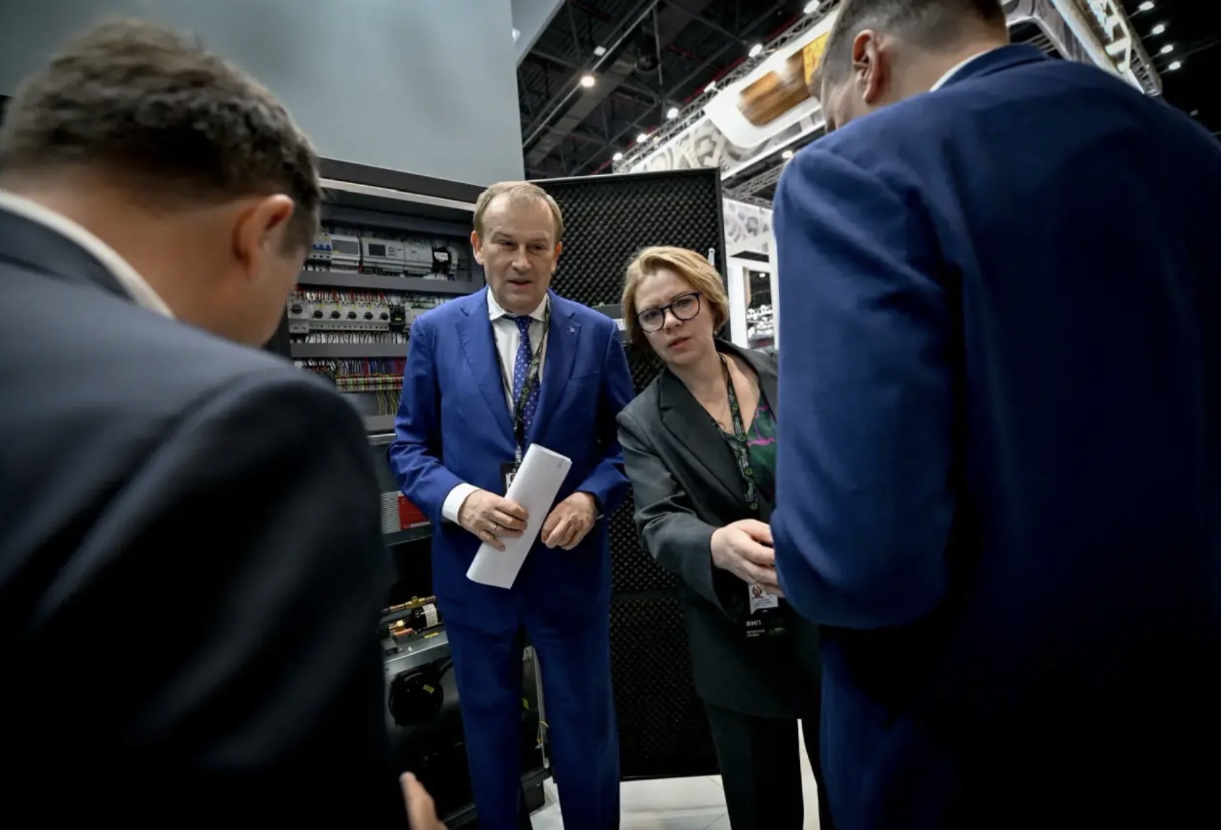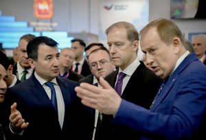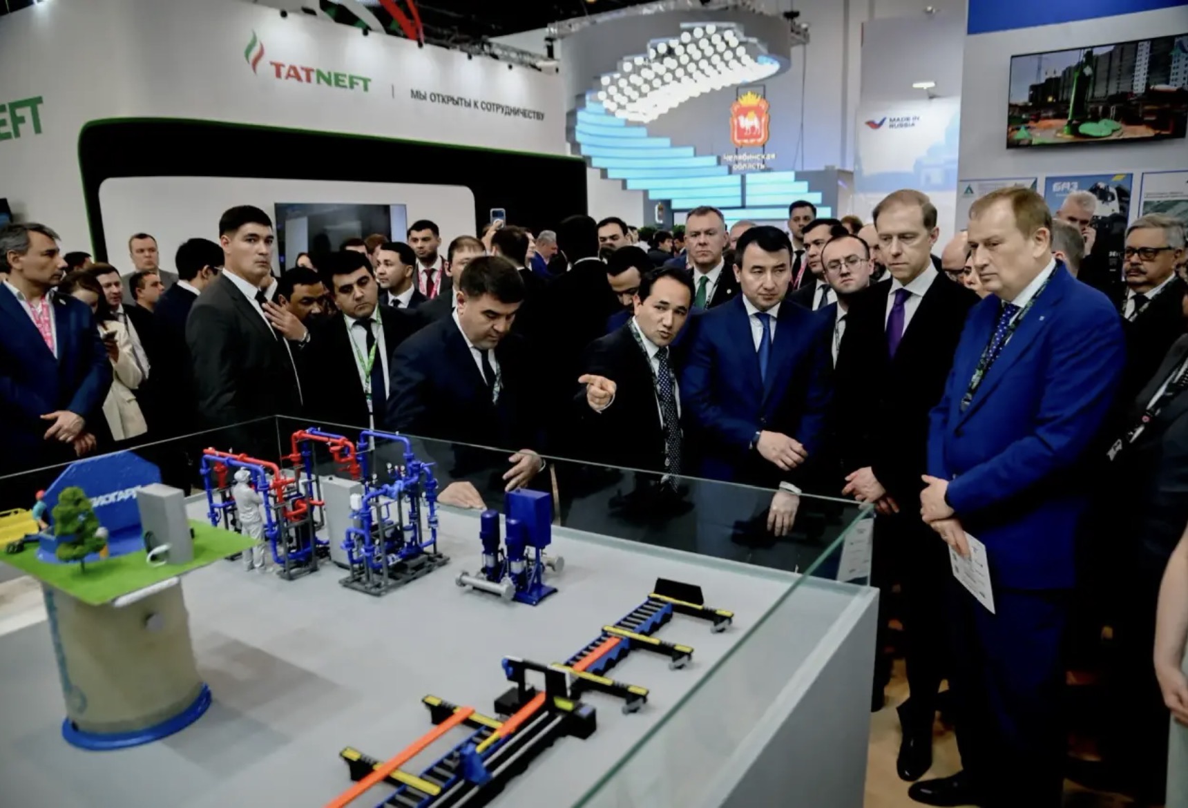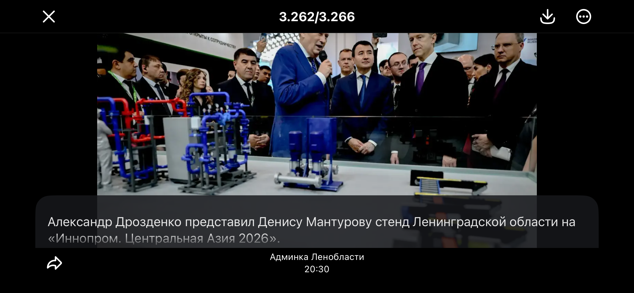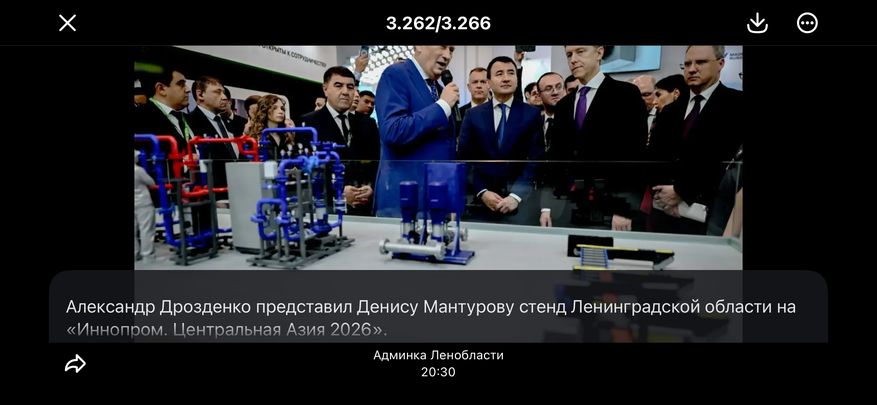 Губернатор Ленинградской области Александр Дрозденко представил первому заместителю председателя Правительства Российской Федерации Денису Мантурову стенд Ленинградской области на выставке «Иннопром. Центральная Азия 2026» в Ташкенте